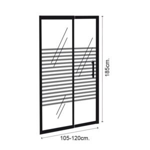 – Para plato de ducha rectangular. – Mampara frontal ajustable. – Ancho: 105-120 cm. – Altura: 185 cm. – Vidrio templado de 6 mm. – Acabado del cristal: serigrafíado. – Una puerta de corredera.