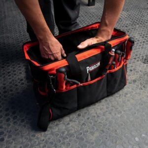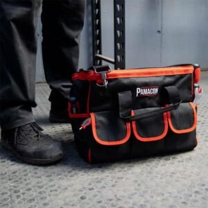 – Bolsa porta herramientas. – Interior acolchado. – Equipada con 28 bolsillos. – Perfecta para guardar y transportar tus herramientas y accesorios de obra más esenciales. – Fabricada en tela resistente de poliéster. – Color: negro con rojo. – Medidas: 42.5 x 20 x 26 cm.