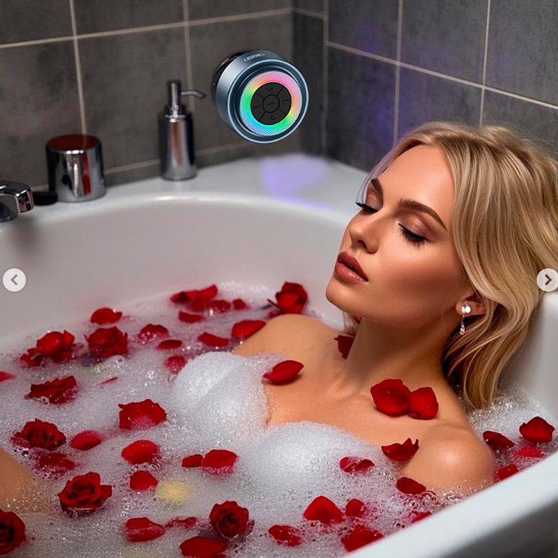 – Altavoz bluetooth. – Impermeable. – Ventosa impermeable para baño. – Se adhiere a azulejos, vidrio y a cualquier lugar. – Dos altavoces que generan un sonido envolvente. – Luces de ambiente RGB.