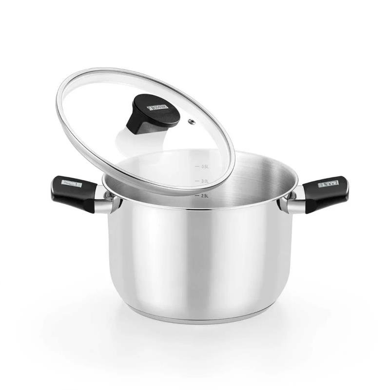 – Batería de acero inoxidable sin antiadherente. – Las cacerolas, ollas y rustidera, vienen equipadas con tapas de cristal templado e indicador de capacidad. – Las asas de baquelita termoestable, aseguran un agarre cómodo y seguro. – Fondo difusor difusor de aluminio de 4.5 mm.