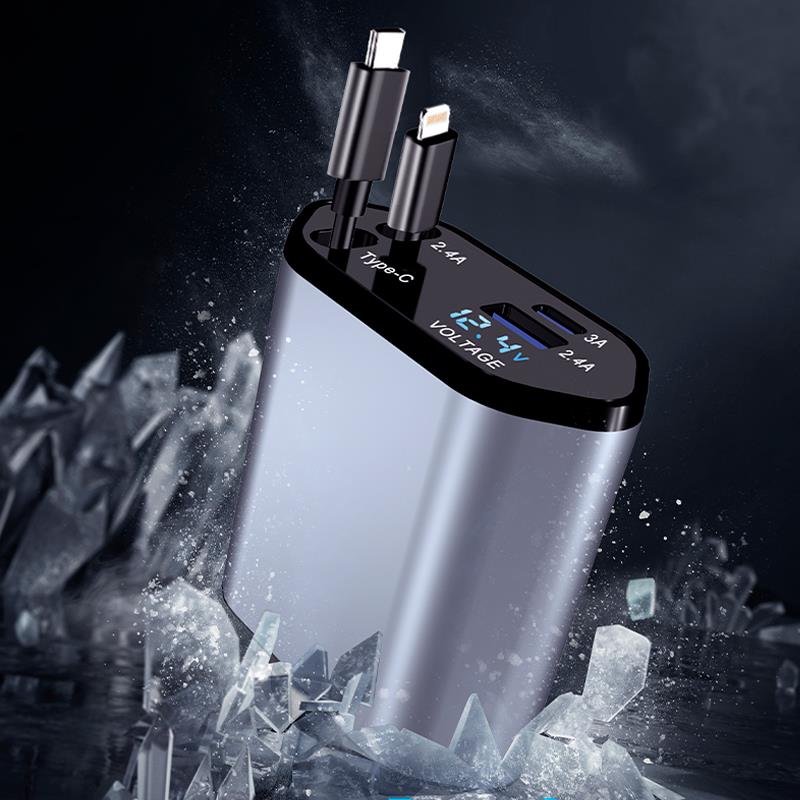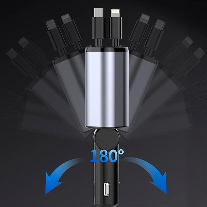 – Cargador de coche 4 en1. – Cargador con dos puertos USB-C yUSB-Ay dos cables extensibles uno con conector USB-C y otro con conector Lightning. – Carga tres dispositivos simultáneamente. – Portátil y fácil de usar.