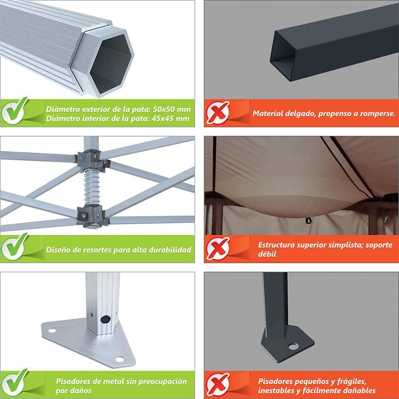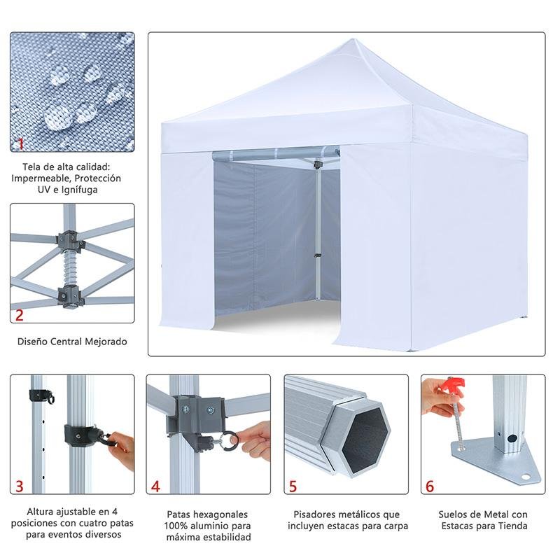 – Estructura de aluminio. – Impermeable. – Patas resistentes hexagonales 50×50 mm. – Paredes laterales conectadas mediante cremallera. – Parte superior de tela ignífuga de poliéster 600D CPAI-84. – Paredes laterales de tela ignífuga de poliéster 300D CPAI-84. – Diseño de resorte para una alta durabilidad. – Sistema telescópico de apertura. – Altura regulable. – Protección UV. – Incluye bolsa de transporte, cuerda, estacas, manual de montaje. – Medidas: 3×3 metros.