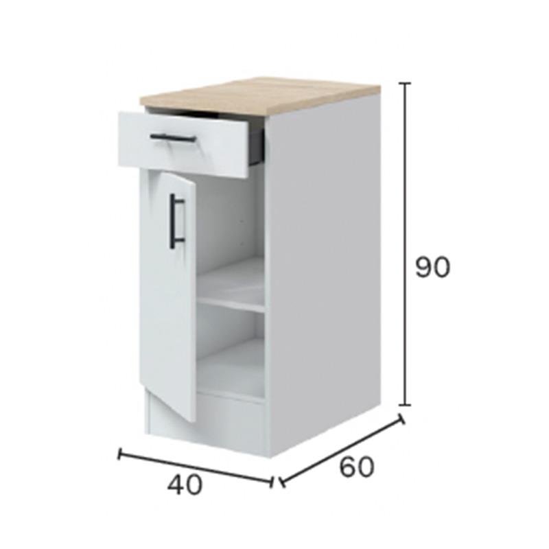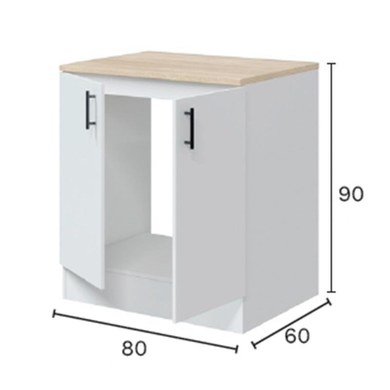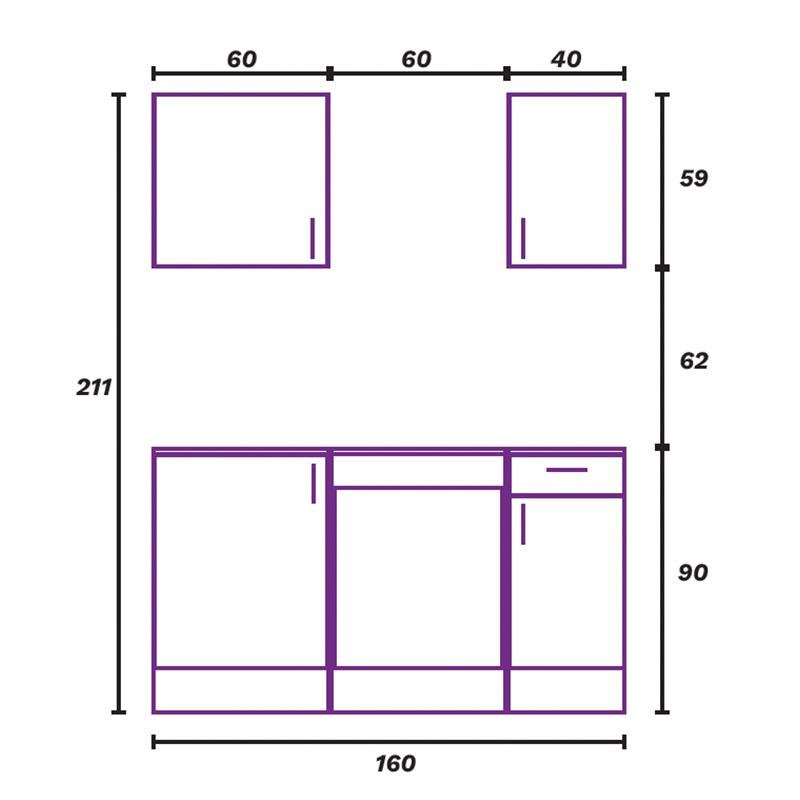 – Cocina de 160+160 de largo. – Mueble bajo fregadero-2 puertas. – Mueble bajo – 1 cajón + 1 puerta. – Mueble bajo – puerta. – Mueble bajo – horno. – Mueble alto – 1 puerta. – Mueble colgar – 2 puertas. – Bisagras metálicas. – Guías ocultas con cierre Soft Close. – Estantes regulables. – Se requieren herramientas y preparación parea realizar el orificio en la encimera a la medida deseada para colocar un fregadero.