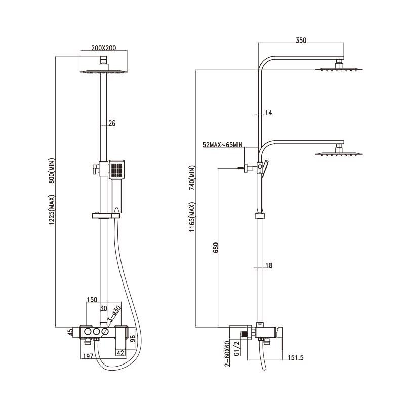 – Barra de ducha extensible de acero inoxidable 304. – Acabado cromado. – Cabezal de ducha cuadrado de 200 x 200 mm. – Mango de ducha SS con soporte. – Manguera de ducha de acero inoxidable de 1.5 m. – Fácil montaje. – Medida columna min 80 cm, max. 122.5 cm.