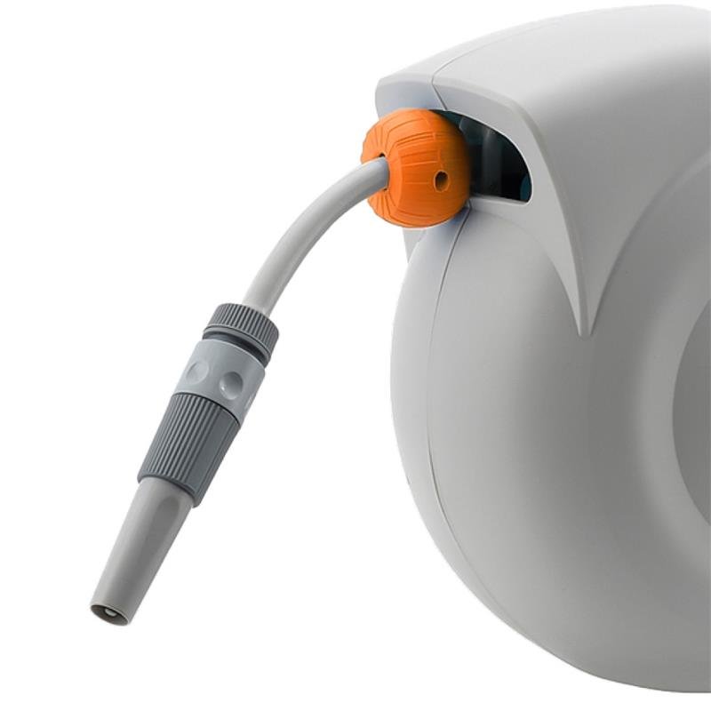 – Recogedor automático. – 20 metros de manguera. – Con soporte para instalar en la pared. – Giro de 180º. – Desenrolla y enrolla fijando la manguera.