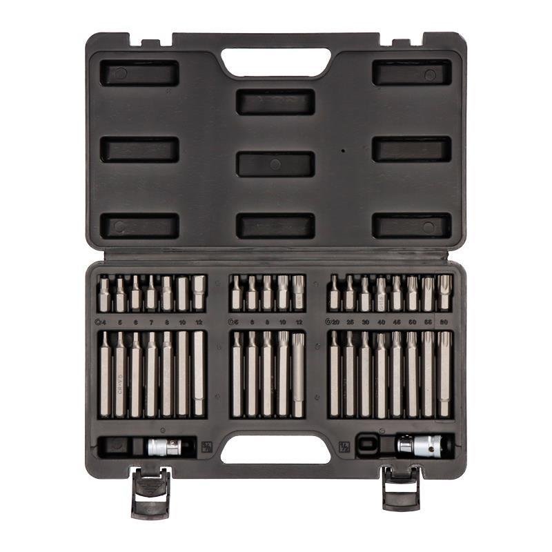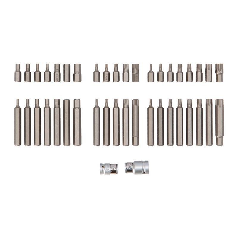 – Maletín de 42 pcs de 12 y 6 cantos inviolables. – Brocas 12 cantos invertidas: – Boca 10 mm: puntas 5, 6, 8, 10, 12 mm. – Boca 10×75 mm largo: puntas M5, M6, 8, 10, 12 mm. – Brocas hexagonales invertidas: – Boca 10 mm: puntas 4, 5, 6, 7, 8, 10, 12 mm. – Boca 10×75 mm largo: puntas 4, 5 (H5), 6, 7 (H7), 8, 10, 12 mm. – Brocas Torx invertidas: – Boca 10 mm: puntas T20, T25, T30, T40, T45, T50, T55, T60. – Boca 10×75 mm largo: puntas T20, T25, T30, T40, T45, T50, T55, T60. – Adaptadores de 3/8″ 10 mm y 1/2″ 10 mm.