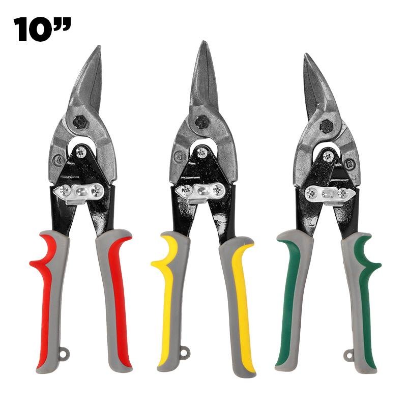 – Juego de tijeras corta chapa 3 piezas. – Tijeras multiusos. Ideales para corte de uso general y corte de alto rendimiento en materiales como cables de cobre y aluminio, chapa, cuero, caucho, PVC, cartón grueso, tela, alfombra, etc. – Cada tijera tiene una hoja afilada para un funcionamiento antideslizante y fácil corte a través de materiales fibrosos. – Empuñaduras ergonómicas para mayor comodidas y control al cortar. – Resorte duradero de apertura automática.