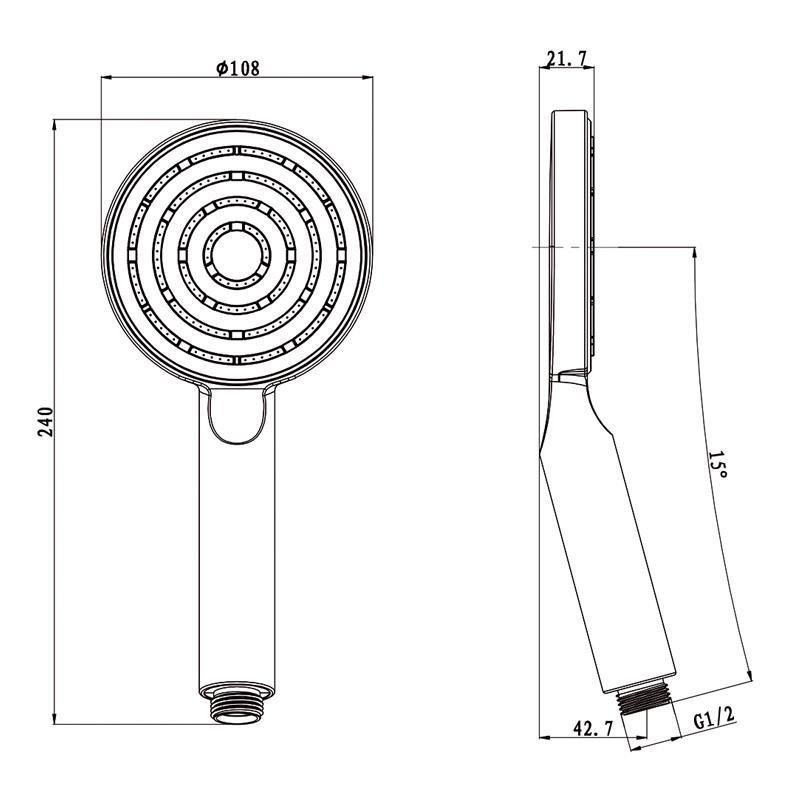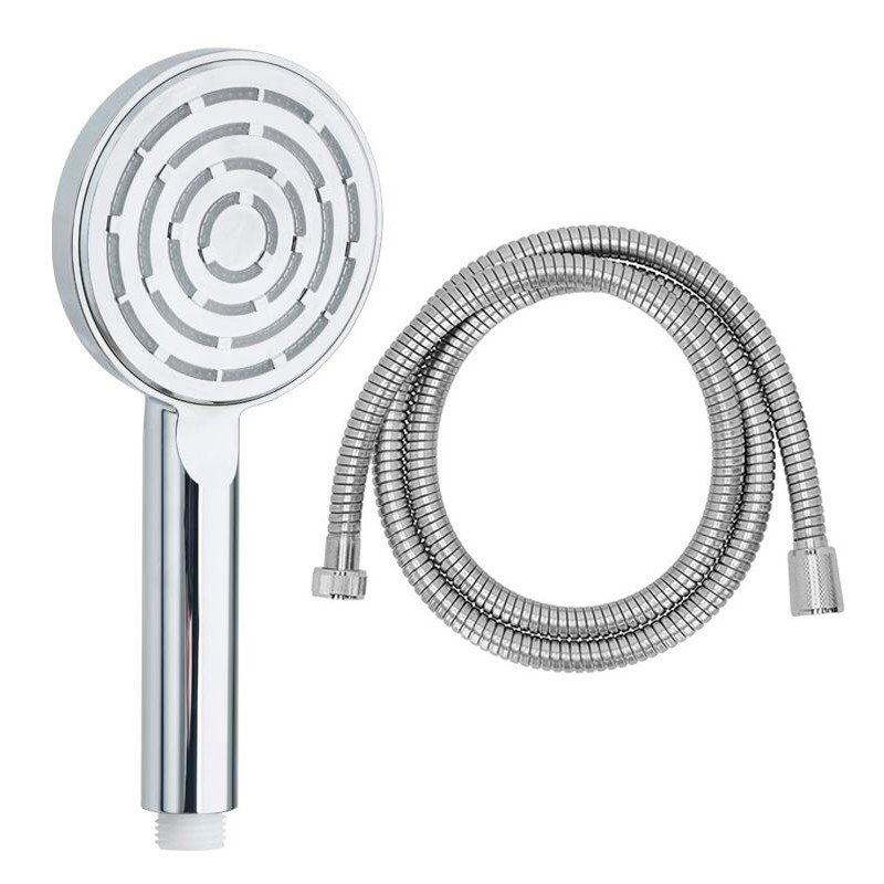 – Mango de ducha Serie Ginebra. – Manguera de 1.5 m. – Salida de agua 0.5 mm. – Diámetro 10.8 cm. – Acabado cromado.
