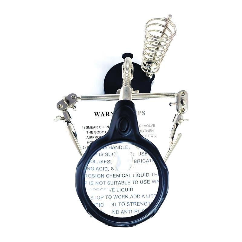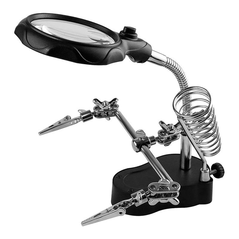 – Lupa aumento perfecta para trabajos de precisión, inspección, reparación y soldadura. – Cristal transparente antiarañazos. – Soporte para soldador. – Pinzas de cocodrilo ajustables en ángulo. – Con luz LED (funciona con pilas AAA*3 no incluidas).