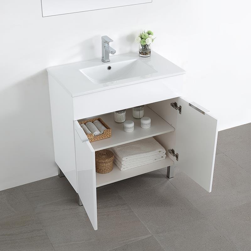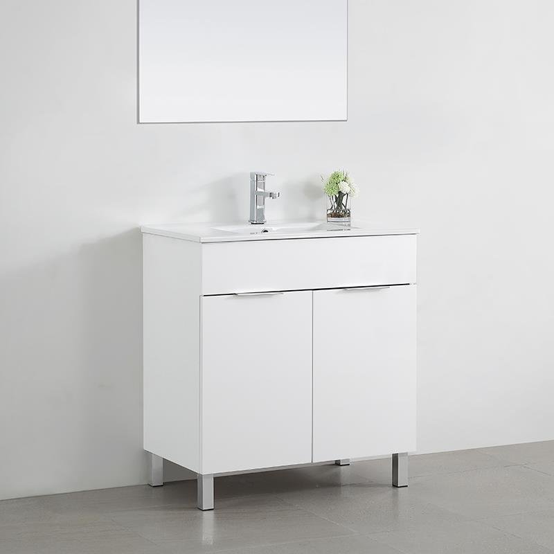 – Mueble de suelo. – Lavamanos cerámico. – Puertas: 2. – Color: blanco. – No incluye grifería. – No incluye espejo. – Medidas: 80 x 46 x 85 cm.