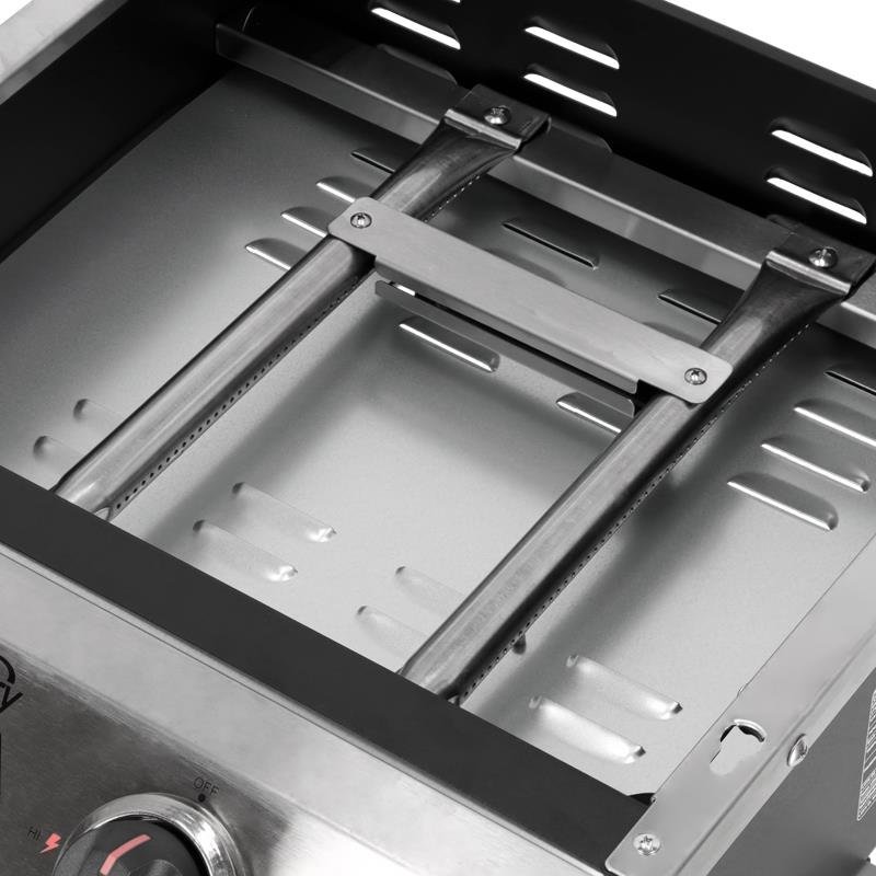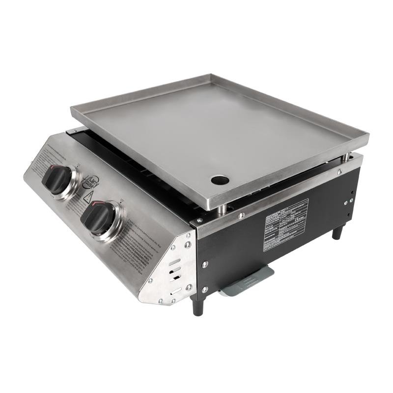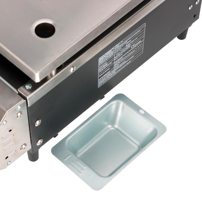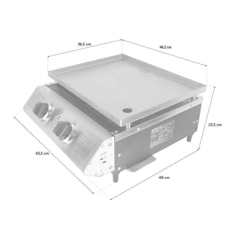– Plancha de gas con dos quemadores. – Ideal para asar pescados, carnes y verduras. – Bandeja recoge grasas. – Superficie antiadherente. – Base y plancha de acero inoxidable. – Llama regulable. – Grosor superficie asado: 2 mm. – Gran superficie de asado: 46 x 40cm.