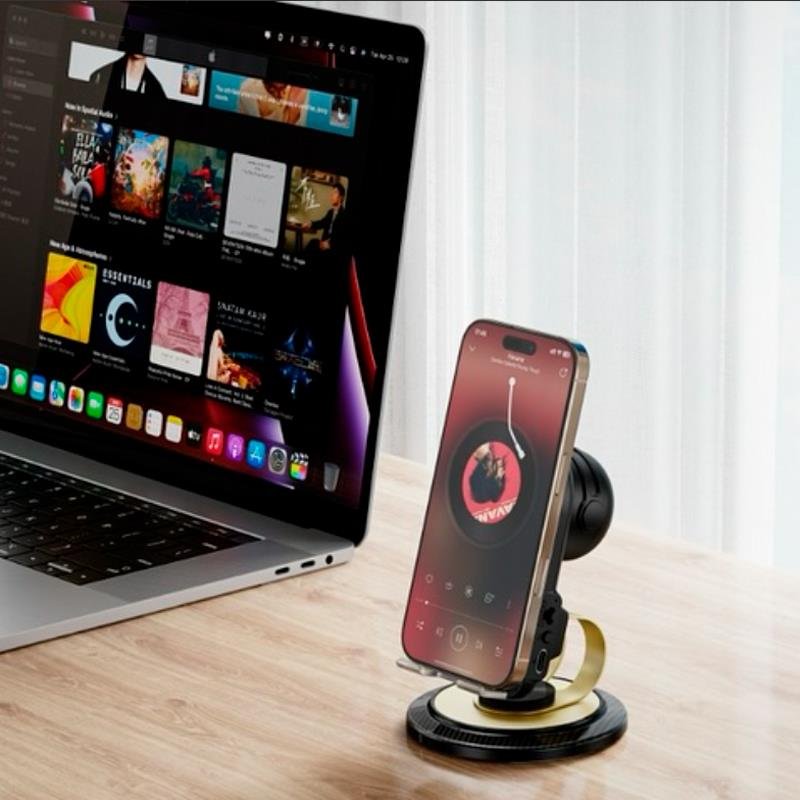 – Soporte para móvil. – Con altavoz inalámbrico. – Carga rápida. – Portátil y fácil de usar.
