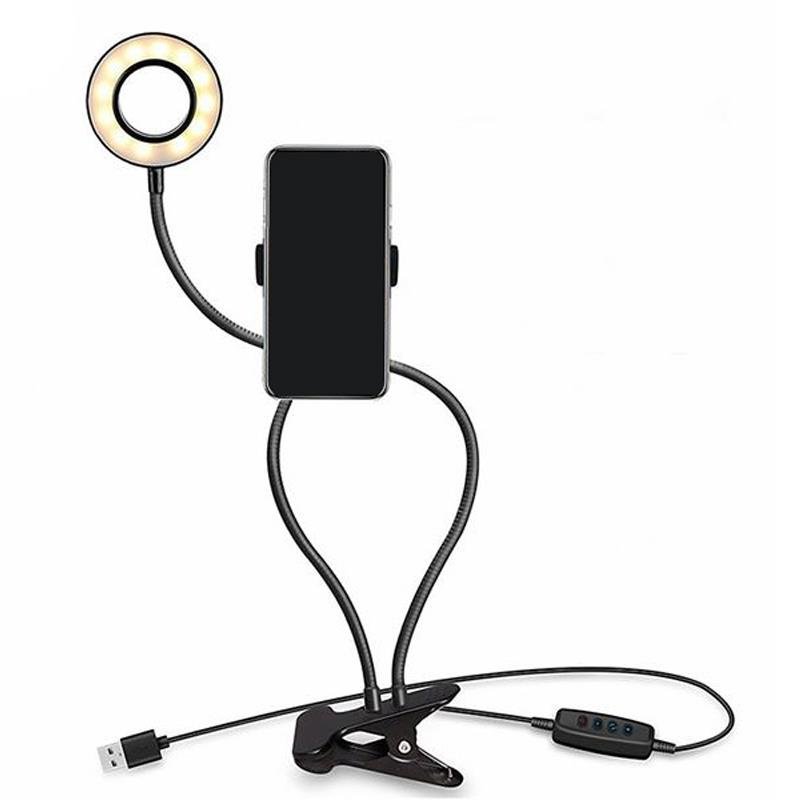 – Pinza para fijación. – Material: aluminio plástico. – Soporte para smartphone apertura hasta 10cm. – Lámpara led de 3″ 12W con mando para regulación de luz. – 4 niveles de iluminación por cada selección de temperatura de color 3000K 5000K. – Alimentación: USB 5V 50/60Hz.