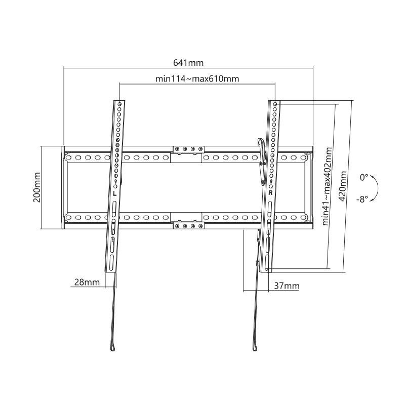 – Fácil instalación y montaje. – Incluye cierre de resorte. – Modelo universal. – Sistema de anclaje compatible con norma VESA (máx. 600×400 mm). – Incluye los accesorios para la instalación. – Plasma / LCD / LED 37 – 80″. – Inclinación de +0º – 8º. – Apta para TV curva. – Distancia pared: 37 mm. – Peso máx: 75 kg.