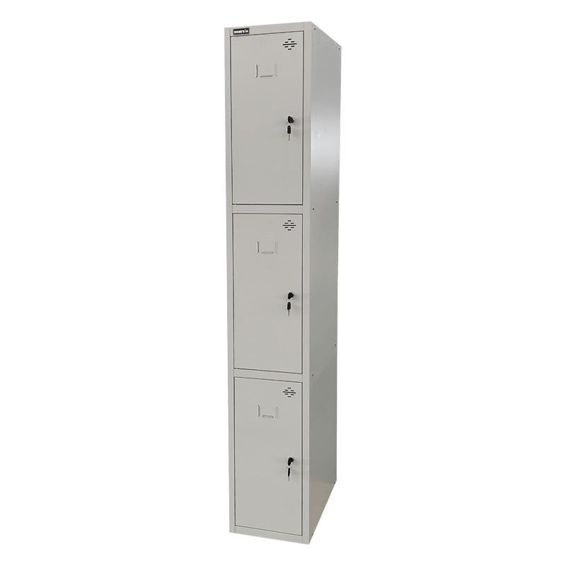 – Taquilla modular metálica de tres puertas. – Ideal para vestuarios, trasteros, almacenes, oficinas, etc. – Estructura de color gris. – Puerta con rejilla de ventilación y portaetiquetas. – Medidas: 180x30x50 cm.