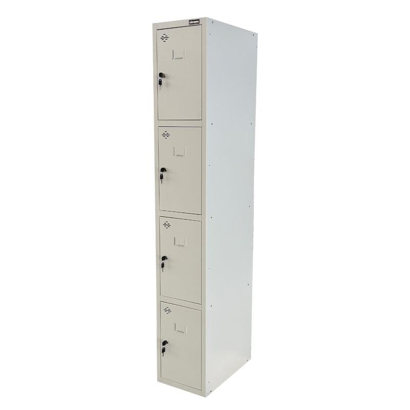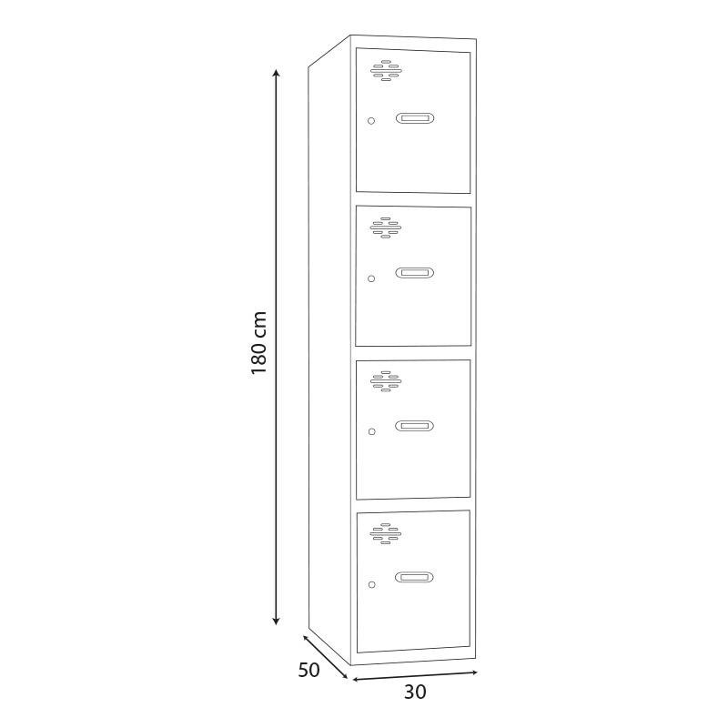 – Taquilla modular metálica de cuatro puertas. – Ideal para vestuarios, trasteros, almacenes, oficinas, etc. – Estructura de color gris. – Puerta con rejilla de ventilación y portaetiquetas. – Medidas: 180x30x50 cm.